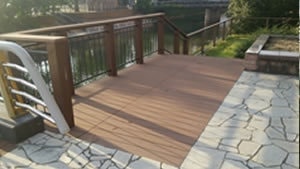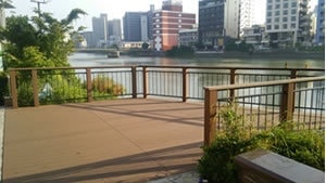 半永久素材と言われる根太材「FFU(ガラス長繊維強化硬質ウレタン樹脂)」を用い、床材には人工再生木材「アシェラウッド」を採用しています。ビス穴の深さの統一等、美観には特に気を使って施工しています。